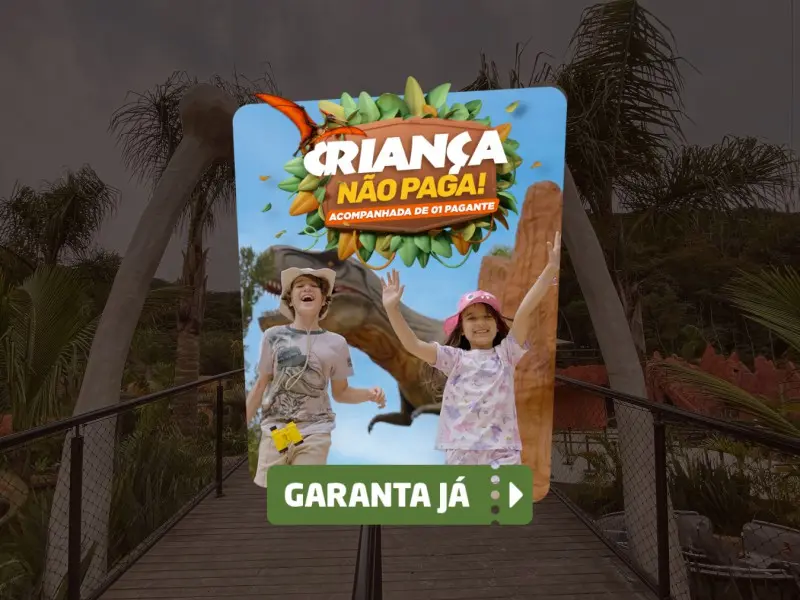 Promoção relâmpago! De 09/10 a 31/10, na compra de 1 ingresso para o Aventura Jurássica, 1 criança de até 12 anos entra GRÁTIS!